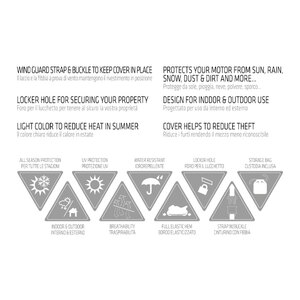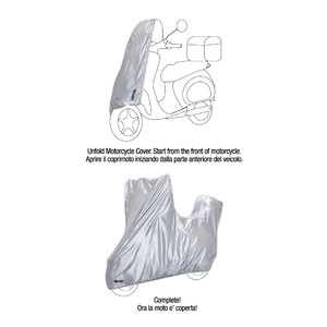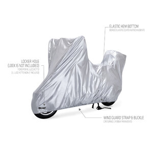 Coprimoto per tutte le stagioni. Ultra leggero con trattamento resistente all'acqua. Presagomato per il parabrezza e il bauletto posteriore. Custodia inclusa. Bordo elasticizzato. Cinturino con fibbia. Foro per il lucchetto (lucchetto non incluso). Per uso da interno ed esterno. UV protection. Traspirante. In tessuto idrorepellente (att.ne: il veicolo si può bagnare se rimane esposto per un lungo periodo di tempo sotto la pioggia, nel bagnato o sulla neve). Il colore chiaro riduce il calore in estate. Protegge da sole, pioggia, neve, polvere, sporco...
