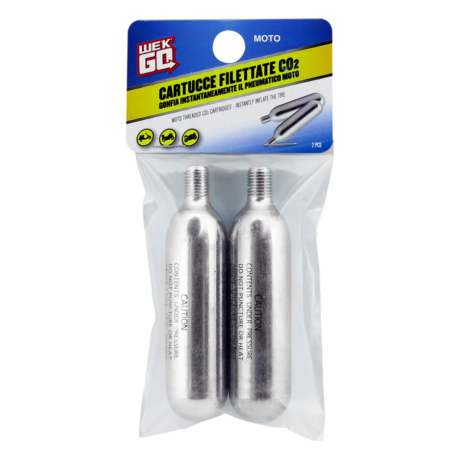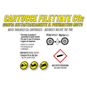 Cartucce filettate Co2. Gonfia istantaneamente il pneumatico. Permette di gonfiare il pneumatico in pochi secondi. Da usare in caso di emergenza. Leggero da trasportare. Contenuto: ricariche CO2 da 16g