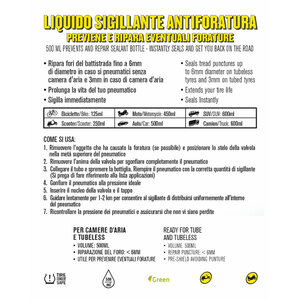 Liquido sigillante antiforatura. Previene e ripara eventuali forature: può essere infatti utilizzato non solo nel momento in cui si verifica una foratura ma anche preventivamente. Per camere d'aria e tubeless. Ripara fori del battistrada fino a 6mm di diametro in caso di pneumatici senza camera d'aria e 3mm in caso di camera d'aria. Prolunga la vita del tuo pneumatico. Sigilla immediatamente. (La grafica della confezione potrebbe variare da quella raffigurata)