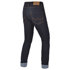 Pantalone da uomo realizzato in tessuto denim di cotone resistente all'abrasione. Tecnologia a filato spalmato. Tessuto a strato singolo, sfoderato. Include cinque tasche esterne. Chiusura con cerniera YKK. Tasche interne per protezioni per fianchi e ginocchia (regolabili a due altezze). Protezioni in schiuma per i fianchi. Protezioni per le ginocchia "Flexishock" rimovibili e certificate EN1621-1:2012 CE Livello 1. Prodotto omologato per moto CE EN17092-4: 2020 Livello A