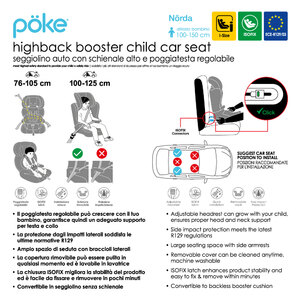 Seggiolino auto con schienale alto e poggiatesta regolabile. Soddisfa i più alti e recenti standard di sicurezza per offrire al tuo bambino un viaggio sicuro. Attacco Isofix: migliora la stabilità del prodotto ed è facile da fissare e rimuovere in pochi minuti. Poggiatesta regolabile: il poggiatesta regolabile può crescere con il tuo bambino, garantisce quindi un adeguato supporto per testa e collo. Ampio spazio di seduta con braccioli laterali. Convertibile in seggiolino senza schienale. Dimensioni prodotto: h69x48x46cm. La copertura rimovibile può essere pulita in qualsiasi momento ed è lavabile in lavatrice. ECE-R129