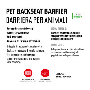 Barriera per animali. Visibilità attraverso la rete. In materiale morbido. Riduce le distrazioni durante la guida. Realizzato in tessuto di maglia traforata. Tessuto resistente agli strappi. Taglia universale adatta alla maggior parte dei veicoli. Collegare e fissare i 4 cinturini con fibbia su entrambi i sedili anteriori, sul poggiatesta e sulla parte inferiore