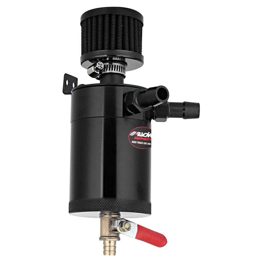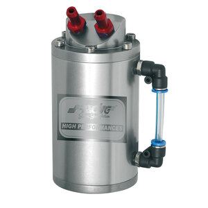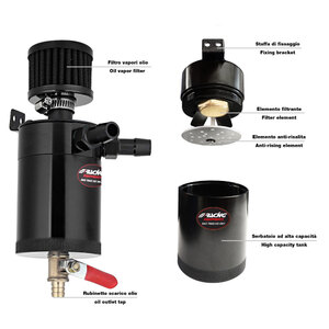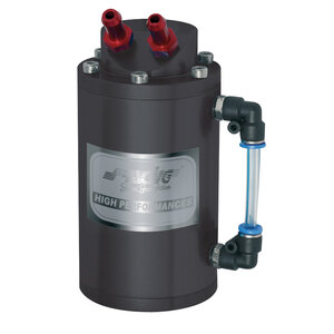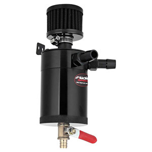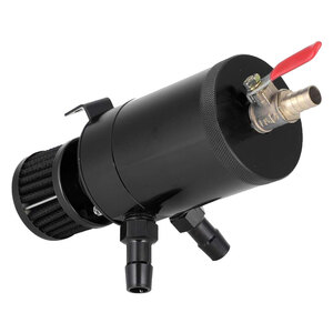 Serbatoio di raccolta dell'olio utilizzato per mantenere pulito il condotto di aspirazione e la farfalla. L'olio contaminato viene separato e rimane nel serbatoio, l'aria purificata del filtro ritorna al sistema di aspirazione. Realizzato in alluminio ad elevata capacità di dispersione del calore. Dispone di un rubinetto sul fondo che ne facilita lo svuotamento. 300ml. Diametro 65mm, altezza 90mm, diametro fori 14mm. Nero