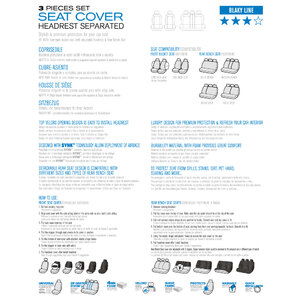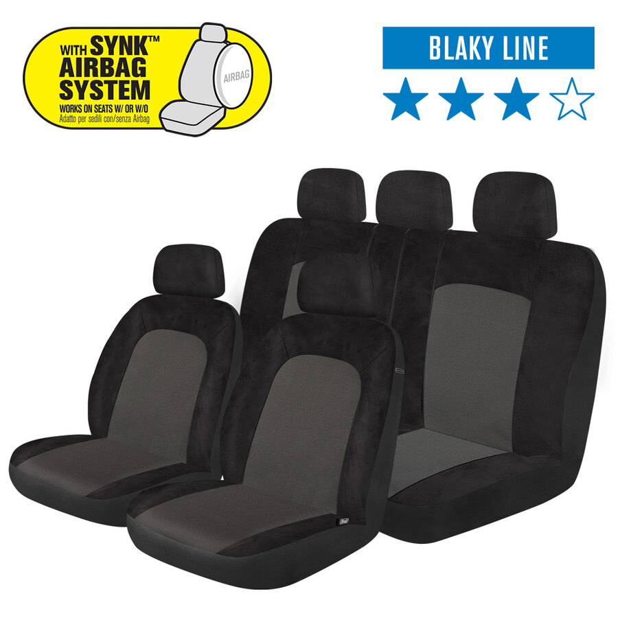Coprisedili universali per auto/SUV con sedile anteriore di misura standard (con poggiatesta separato regolabile) e posteriore a panca. Luxury design per una protezione completa e un rinnovamento degli interni della vostra auto. Progettati con la tecnologia Synk, consente l'apertura degli airbag. Adatto per sedili con e senza airbag. Apertura superiore in Velcro per un'installazione semplice del poggiatesta. Il particolare design dei coprisedili posteriori ne garantisce la compatibilità con diversi formati e modelli di sedili grazie allo schienale divisibile con zip. Utili per proteggere il sedile da macchie, sporco, peli di animali, ecc. Realizzati in materiali di alta qualità con speciale gomma piuma alta dal grande comfort. Contenuto: 2 coprisedili anteriori schienale e seduta; 1 coprisedile a panca posteriore (copri poggiatesta inclusi per la parte anteriore/posteriore)