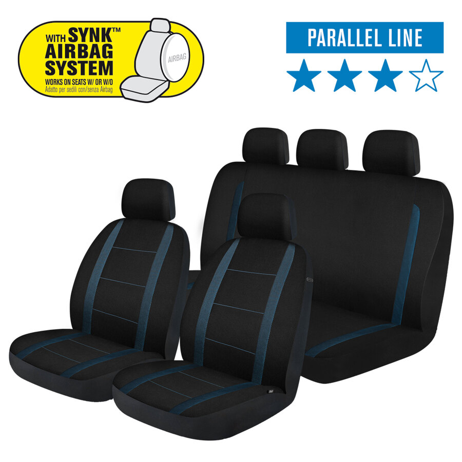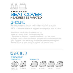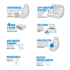 Coprisedili universali per auto/SUV con sedile anteriore di misura standard (con poggiatesta separato regolabile) e posteriore a panca. Luxury design per una protezione completa e un rinnovamento degli interni della vostra auto. Tessuto Air Mesh: massima ventilazione. Progettati con la tecnologia Synk, consente l'apertura degli airbag. Adatto per sedili con e senza airbag. Apertura superiore in Velcro per un'installazione semplice del poggiatesta. Il particolare design dei coprisedili posteriori ne garantisce la compatibilità con diversi formati e modelli di sedili grazie allo schienale divisibile con zip. Utili per proteggere il sedile da macchie, sporco, peli di animali, ecc. Realizzati in materiali di alta qualità con speciale gomma piuma alta dal grande comfort. Contenuto: 2 coprisedili anteriori schienale e seduta; 1 coprisedile a panca posteriore (copri poggiatesta inclusi per la parte anteriore/posteriore)