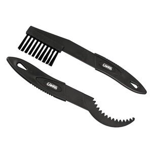 Coppia di resistenti spazzole in PVC. Puliscono in modo facile e veloce raggiungendo gli angoli più nascosti. La spazzola pulisce corona, pignone e catena, mentre la mezzaluna dentata è specifica per la rimozione dello sporco accumulato tra i vari ingranaggi