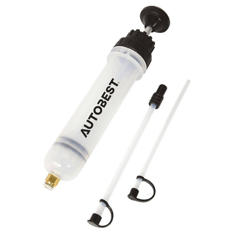 Siringa multiuso. Questa siringa permette di riempire e aspirare tutti i tipi di olio, gasolio, liquido freni e liquido refrigerante (non adatto per benzina). Siringa graduata in plastica trasparente. Capacità: 200ml. 1 tubo diam. 6mm lunghezza 19cm. 1 tubo diam. 8mm lunghezza 19cm. Tappi per tubi in gomma. I 2 tubi possono essere assemblati tramite il connettore in gomma per formare un unico tubo da 38cm