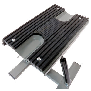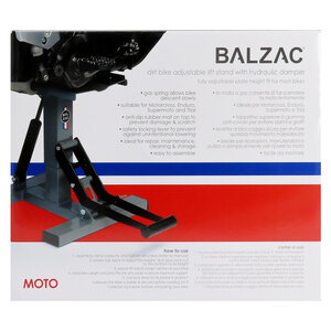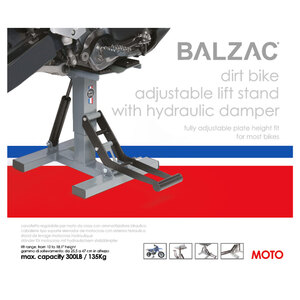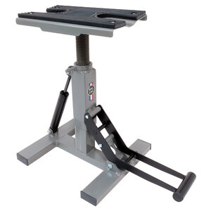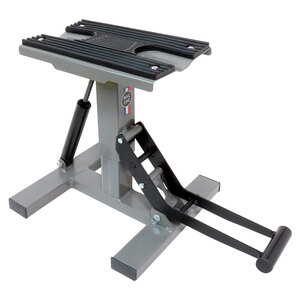 Cavalletto regolabile per moto da cross con ammortizzatore idraulico. Range di sollevamento: 25,5>47cm. Max load 135kg. La molla a gas consente di far scendere la moto lentamente. Ideale per Motorcross, Enduro, Supermoto e Trial. Tappetino superiore in gomma anti-scivolo per evitare danni e graffi. Levetta di bloccaggio sicuro per evitare qualsiasi movimento indesiderato. Ideale per riparazioni, manutenzioni o pulizia o semplicemente per riporre la moto. Facile da montare