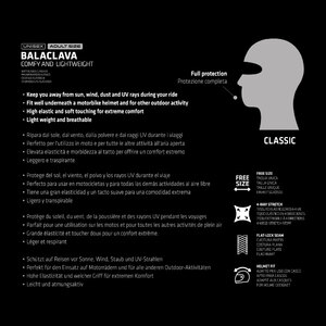 Sottocasco classico. Ripara dal sole, dal vento, dalla polvere e dai raggi UV durante i viaggi. Perfetto per l'utilizzo in moto e per tutte le altre attività all'aria aperta. Elevata elasticità e morbidezza al tatto per offrire un comfort estremo. Leggero e traspirante. Tessuto elasticizzato a 4 vie