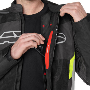 Giacca da uomo in tessuto, ventilata, con interno removibile antivento. Giacca esterna in tessuto armaturato e pannelli in tessuto traforato. Collo con margine in neoprene, interno in microfibra e chiusura frontale con bottone a pressione. Chiusura frontale con zip. 2 tasche al fondo con chiusura zip. Multi regolazioni su maniche, fondo e polsi. Ampie aree di ventilazione su torace, maniche e schiena. Dettagli riflettenti su spalle e schiena. Interno foderato in tessuto traspirante. 2 tasche interne con velcro. Tasca interna impermeabile con zip. Zip di connessione su punto vita interno per collegare la giacca ai pantaloni della collezione AXO. Interno removibile e ripiegabile in tessuto antivento. Certificato secondo normativa EN17092:2020 - Livello: Classe A. Protezioni EN1621-1 di Livello 1 Type A su spalle e gomiti. Predisposizione paraschiena EN1621-2 liv. 2 (paraschiena non incluso L 1903888 L>5XL, M 1903889 S>M)