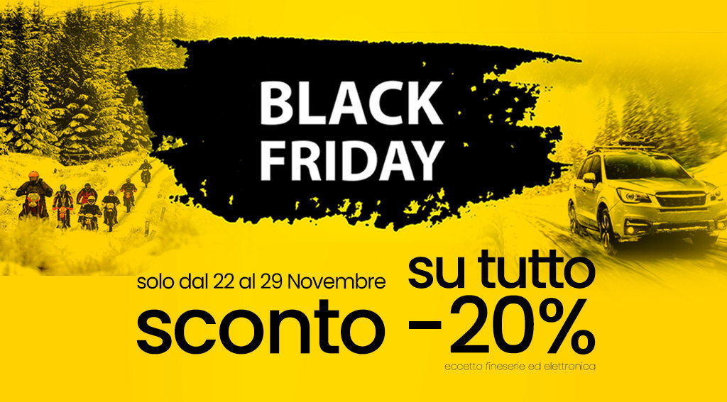 - Solo dal 22 al 29 Novembre potrai approfittare dell'EXTRA SCONTO -20% su tutto* ciò che hai sempre desiderato per la tua auto, moto e bici.Leggi di piu' »