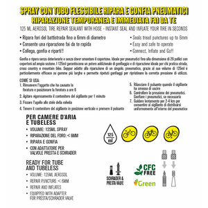 Gonfia e ripara pneumatici senza deteriorarli e senza dover smontare il copertone. Spray con tubo flessibile. Ideale per pneumatici fino a 29 pollici con copertoni ad ampia sezione. I 125ml garantiscono un potere addizionale di gonfiaggio e di riparazione ideale per chi pratica strada, cross country e mountain bike. Seppur adatto alla riparazione di un singolo pneumatico, grazie al suo volume di 125ml è particolarmente efficace su gomme più larghe e permette ripetuti gonfiaggi per ripristinare la corretta pressione di utilizzo. Riparazione temporanea e immediata fai da te. Ripara fori del battistrada fino a 6mm di diametro. Consente una riparazione fai da te rapida. Collega, gonfia e riparti!! Per camere d'aria e tubeless. Con adattatore per valvole Presta e Schrader. (La grafica della confezione potrebbe variare da quella raffigurata)