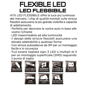 HYX Flessibile offre la luce più luminosa del mercato. I chip di qualità montati sulle strisce flessibili (SDM) assicurano la più grande visibilità e capacità di adattamento. LED impermeabile ad alta luminosità. Con strisce autoadesive 3M per un montaggio facile e in sicurezza. Può essere tagliata ogni 3 LED o multipli di 3 seguendo il punto di taglio. Adattabile, ritagliabile, durevole. Una luce super luminosa mai vista. 12V. Ideale per applicazioni su auto, moto e motocicli
