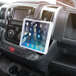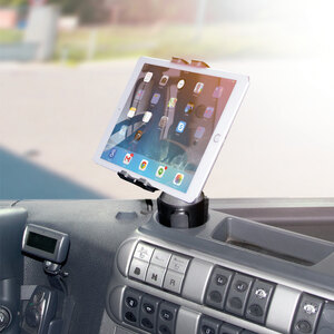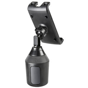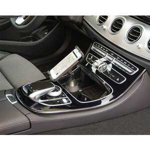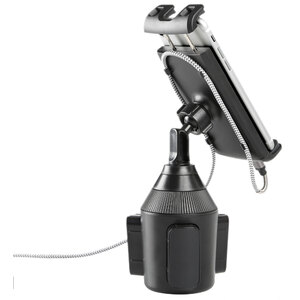 Porta telefono/tablet per inserimento nel portalattina. Rivestimento interno gommato anti scivolo e anti graffio. Base espandibile per adattarsi e fissarsi ad ogni porta lattina (diam. 65-85 mm). Compatibile con dispositivi da 125 a 180 mm di altezza o larghezza. Non ostruisce la porta Aux e ricarica. Ganci organizer fermacavo sul retro del porta telefono