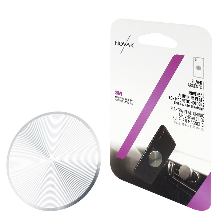 Piastra ultrasottile in alluminio, universale per supporti magnetici. Placca con adesivo 3M. Design stiloso e ultrasottile. Realizzato in alluminio di alta qualità. Pellicola protettiva trasparente inclusa per proteggere il vostro smartphone. La confezione inlcude: 1x piastra con adesivo 3M, 1x pellicola protettiva