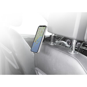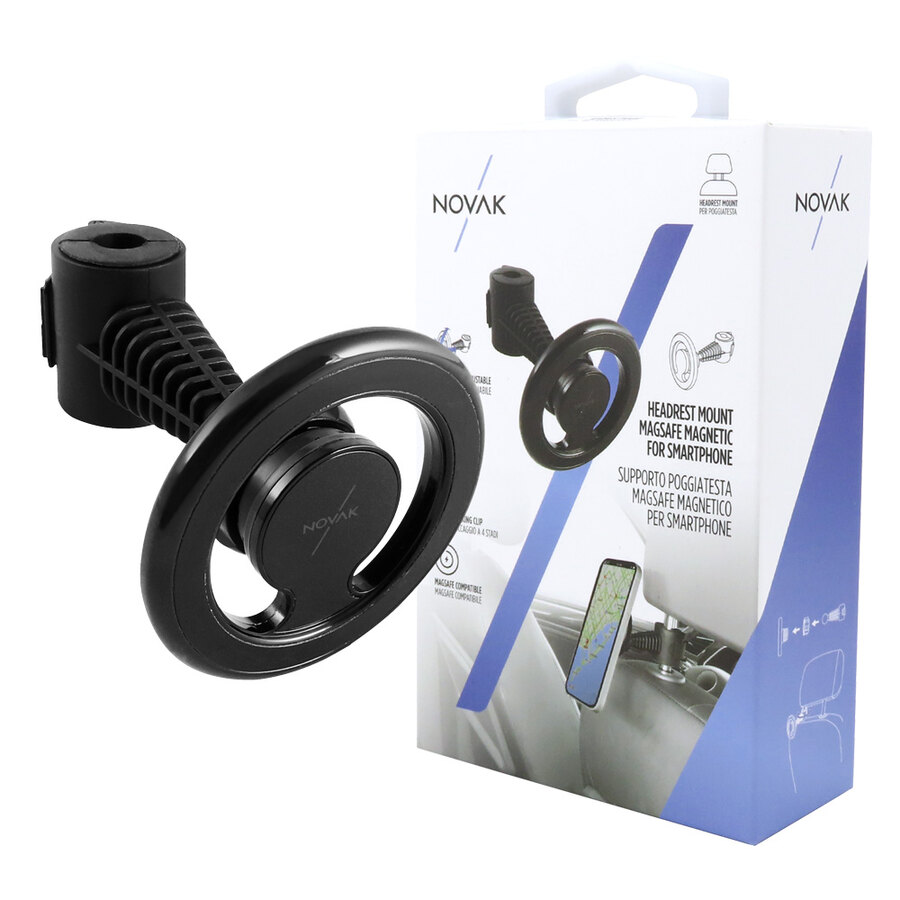 Supporto poggiatesta MagSafe magnetico per smartphone. Regolabile ed inclinabile per una semplice regolazione degli angoli di visione. Semplice installazione e rimozione dal poggiatesta. Compatibile con aste poggiatesta diametro 10>17mm. Clip di bloccaggio a 4 stadi. Compatibile con iPhone12 e successivi. Dotato di forti magneti per mantenere lo smartphone in posizione in modo sicuro. Per smartphone SENZA funzione MagSafe, è necessario l'acquisto di un altro accessorio per poter utilizzare questo prodotto (vedere nostro codice 1839067)