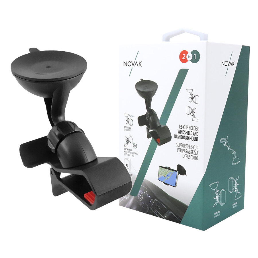Supporto EZ-Clip per parabrezza e cruscotto. Compatibile con smartphone max 90mm. Regolabile a 360°. Compatibile con la maggior parte degli smartphone. Impugnatura rapida con ganascia espandibile. Design resistente agli urti. Cuscinetti in silicone anti graffio e anti scivolo. Montaggio a ventosa super forte e sicuro