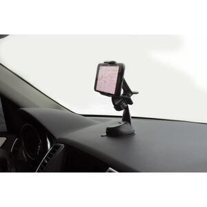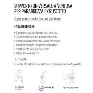 Supporto universale per parabrezza e cruscotto, rotante di 360°. Smartphone posizionabile con una sola mano. Impugnatura rapida con ganascia espandibile: max 100mm. Facile da installare con fissaggio a ventosa. Ganascia resistente e bloccaggio di sicurezza per fissare saldamente il dispositivo. Cuscinetti in silicone antigraffio e anti scivolo. Design resistente agli urti