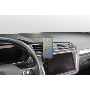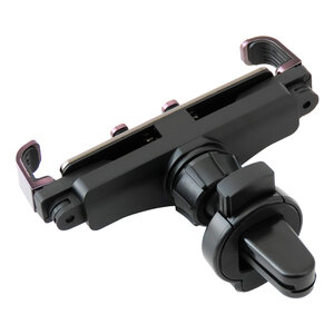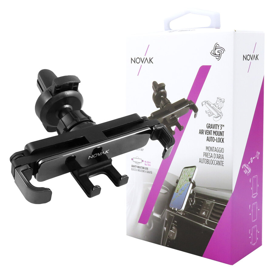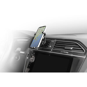 Supporto da presa d'aria, autobloccante. Compatibile con smartphone: min 60mm, max 75mm. Regolabile a 360°. Speciale design che permette di usarlo con una sola mano, facilitando l'inserimento e l'estrazione del telefono. Morsetti a molla robustio per tenere saldamente il telefono.. Nessuna ostruzione all'uscita dell'aria