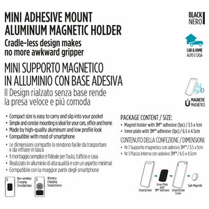 Mini supporto magnetico in alluminio con base adesiva. Il design rialzato senza base rende la presa veloce e più comoda. Placca con adesivo 3M. Realizzato in alluminio dialta qualità, design minimal. La confezione include: 1x supporto magnetico con adesivo 3M, 1x placca interna con adesivo 3M