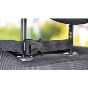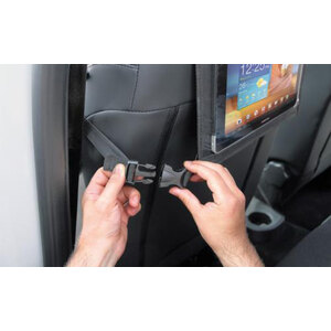 Organizer porta-tablet per sedili posteriori. Si fissa al poggiatesta anteriore tramite cinghie regolabili. La tasca con finestra trasparente permette la visione e le funzioni touch-screen. Tablet max 20x28 cm