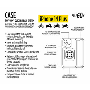 Custodia per iPhone 14 Plus con sistema di aggancio/sgancio rapido Polygon. Fodera interna antigraffio. Protezione massima da cadute, realizzata con materiali di alta qualità. Sistema di bloccaggio integrato nel case: permette il fissaggio istantaneo con diversi supporti (supporto non incluso, va acquistato separatamente, vedere nostri codici 1978901, 1978902, 2059764).
