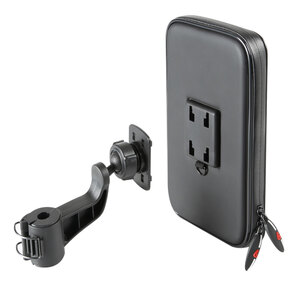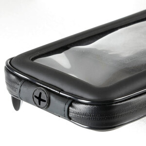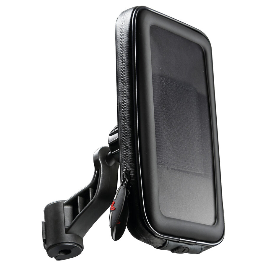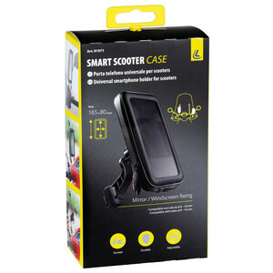 Porta telefono universale per scooter. Porta telefono con attacco per specchietto o parabrezza. Completamente orientabile per migliorare l?angolo visivo. Inserti gommati antigraffio e antiscivolo. Gancio di sicurezza incluso. Foro passacavo per cavo ricarica. Pellicola frontale termosaldata per aumentare la resistenza all'acqua. Zip laterali resistenti alla pioggia. Tasche porta tessere interne. Compatibile con tubi diam. 9-14mm