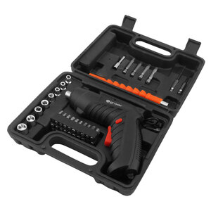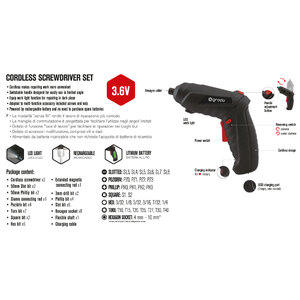 Avviatore/svitatore elettrico a batteria. La modalità "senza fili" rende il lavoro di riparazione più comodo. Il design dell'impugnatura è progettao per facilitare l'utilizzo negli angoli limitati. Dotato di funzione "luce di lavoro" per facilitare le riparazioni nei luoghi bui. Dotato di accessori multifunzione, compresi viti e dadi. Alimentato da batteria al litio ricaricabile che non richiede l'acquisto di batterie di ricambio. 3.6V