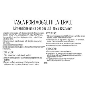 Tasca portaoggetti laterale compatibile con la maggior parte degli smartphone di ultima generazione fino a 5,7" quali iPhone, Samsung Galaxy/Galaxy Edge, Note 4 e altri. Forma speciale che permette di ricaricare e custodire il vostro telefono nello stesso tempo. Puo' contenere anche biglietti da visita, carte di credito, promemoria e altro ancora.. Accesso veloce e nessuna confusione. Facile da attaccare su cruscotti, porte e altre superfici grazie all'adesivo 3M di alta qualità