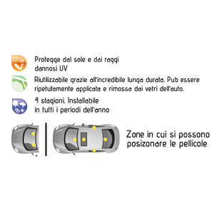 Questa innovativa pellicola statica è stata progettata su misura per il cliente più esigente. Applicata al parabrezza blocca immediatamente i raggi U.V. frontali e la luce accecante del sole. Grazie all'elettricità statica si installa in pochi instanti. Puo' essere rimossa e riutilizzata in qualsiasi momento. La speciale trama permette un'applicazione perfetta su tutti i tipi di curvature vetro e la possibilità di rimuoverla per applicarla da un'altra parte senza rovinarla minimamente. Indicata per il parabrezza, può comunque essere applicata a qualsiasi vetro