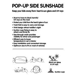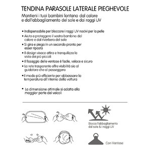 Tendina parasole laterale pieghevole. Fissaggio con ventose: facile, veloce e sicuro. Blocca l'abbagliamento dal sole e i raggi UV nocivi per la pelle. Aiuta a proteggere il vostro bambino dal calore e dal riverbero del sole. Si gira e piega in un secondo pronta per essere riposta. Il design vivace attira e tranquillizza la vista dei più piccoli. Il tessuto trasparente offre visibilità sia al guidatore che al passeggero. Il modo più efficace per abbassare la temperatura all'interno della vettura. La dimensione ottimale si adatta alla maggior parte dei veicoli