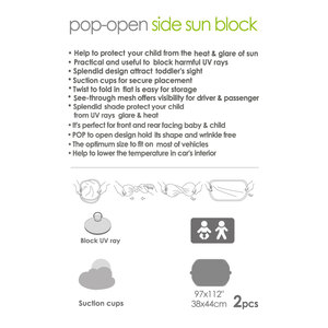 Tendina parasole laterale ad apertura a scatto. Il design pop-up una volta aperto mantiene la sua forma ed evita la formazione di grinze. La dimensione ottimale si adatta alla maggior parte dei veicoli. Aiutano ad abbassare la temperatura all'interno dell'abitacolo. La gradevole ombra che si crea protegge il vostro bambino dall'abbagliamento causato dai raggi UV