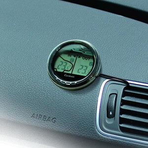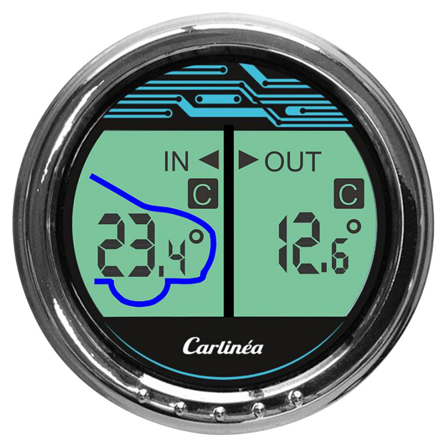 Termometro interno esterno : da -50°c a +50°c. Display LCD su 2 zone con pittogrammi. Fissaggio: adesivo o pinza su bocchette d'aria. Dotato di una mini sonda con filo da 3m. Accessori e pila in dotazione. French design