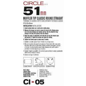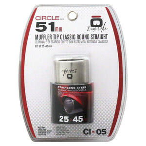 Terminale tondo 51mm. Adatto per scarichi con uscita 25>45mm Ingresso: 60mm Lunghezza: 90mm Installazione: raccordo a vite. Forma classica dritta con design dai bordi laminati. Acciaio inossidabile di alta qualità. Non necessita di saldature e trapanature. Universale: si adatta alla maggior parte delle uscite delle marmitte. Sistema di fissaggio incluso