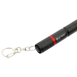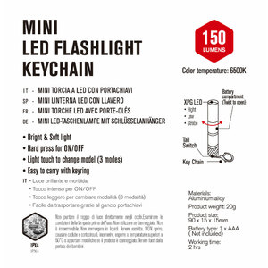 Mini torcia a Led con portachiavi. Luce brillante e soft. Interruttore On/OFF. 3 modalità selezionabili. Facile da trasportare grazie al gancio portachiavi. IPX4. Peso: 20g. Dimensioni: 90x15x15mm. Batteria: 1x AAA (non inclusa)