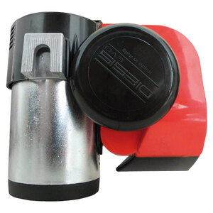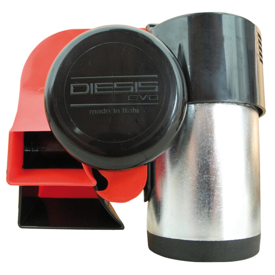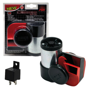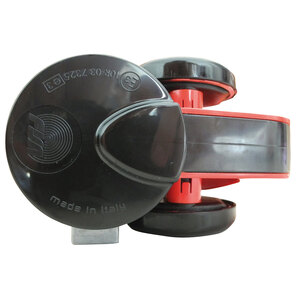 Elettrocompressore a 12V. Cornetto in resina ABS. Moderno,compatto, trendy. Alta tecnologia e alteprestazioni in spazio ridotto. Montaggio nel cofano motore, sotto la carena della moto, in ogni caso al riparo dalle intemperie dirette. Omologazione CEE-ECE. 115 dB a 2 mt. Potenza assorbita circa 240 Watt. Frequenza ALTA circa 620 Hz. Frequenza BASSA circa 515 Hz