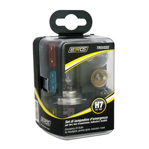 Set di lampade d'emergenza per fari, luci di posizione, indicatori e fusibili. Comprende: 1xH7 12V 60/55W, 1xS25 BA15S 12V 21W, 1xS25 BAY15D 12V 21/5W, 1xG18 BA15S 12V 5W, 1xT10 12V 5W, fusibile 10A, 15A, 20A