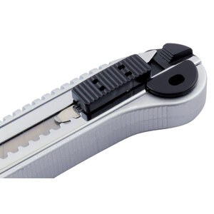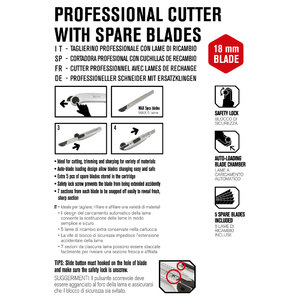 Taglierino professionale con lame di ricambio. Ideale per tagliare, rifilare e affilare una varietà di materiali. 4 lame di ricambio (la confezione include in totale 5 lame). La vite di blocco di sicurezza impedisce l'estensione accidentale della lama. Da ciascuna lama possono essere staccate facilmente 7 sezioni. Dimensioni taglierino: 15,7x4x2,5cm Dimensioni lama: 18x0,5mm (spessore). Peso: 111g Materiale: ABS. Materiale lama: acciaio al carbonio