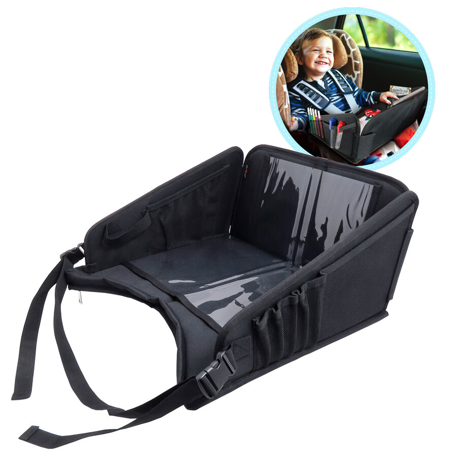Vassoio da viaggio per bambini. Per mangiare e giocare. Intrattieni il tuo bambino mentre siete in auto, in pulmann, in treno, ecc... Interno in schiuma morbida con supporto in resina: vassoio comodo e stabile. Le fasce con fibbie regolabili rendono il vassoio sicuro e stabile. Le tasche a rete con elastico permettono di custodire giocattoli, penne, libri, ecc. Si pulisce facilmente. Il design curvo ergonomico offre un elevato livello di comfort. Prodotto privo di coloranti azoici. Inodore e rispettoso dell'ambiente. Si pulisce facilmente con un panno umido