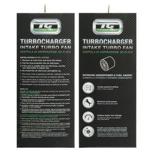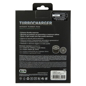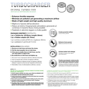 Ventola di aspirazione ad elica. Aumenta la potenza ed il risparmio di carburante. Migliora la risposta dell'acceleratore. Crea un flusso potente. Riduce al minimo l'inquinamento atmosferico generando al contempo il massimo flusso d'aria possibile. Fornisce un controllo più dinamico sul sistema di aspirazione forzando un flusso d'aria potente nella camera di combustione ad alta velocità. Permette di ottenere una migliore resa chilometrica. Realizzato in alluminio leggero e di alta qualità. La confezione include: 1pz x ventola a turbina (diam. 65 mm, lunghezza: 50mm); 1pz x adattatore in gomma (diam. 75 mm)