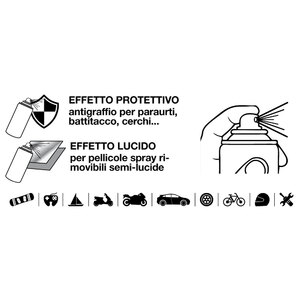 Si spruzza come una vernice, si toglie come una pellicola. Vernice speciale elastica, crea una pellicola protettiva rimovibile. Applicabile su superfici lisce e non assorbenti come metallo, alluminio, plastiche dure verniciabili, vetro. Piccole imperfezioni nella pellicola sono facilmente riparabili applicando nuovamente il prodotto. Il fondo deve essere pulito, asciutto, senza ruggine e sgrassato. Non applicare su superfici porose. Mascherare le parti da non verniciare! Agitare la bomboletta per 3 min. Fare una prova di spruzzo. Effettuare test di compatibilità della vernice su una parte non visibile. Applicare minimo 5 mani incrociate da una distanza di 25cm. Lasciare evaporare 5 minuti tra una mano e l'altra. Nei punti difficili (ad es.angoli, spigoli), la pellicola applicata deve essere sufficientemente spessa per evitarne la rottura durante la rimozione. Asciutto e rimovibile dopo circa 2 ore. 1 bomboletta 400ml è sufficiente per 2 cerchi.