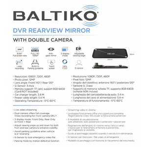 Specchio retrovisore con DVR, touch screen. Doppia camera: anteriore + posteriore. Streaming video in diretta. La doppia fotocamera offre una copertura completa. Registrazione video solo per la fotocamera anteriore. 3 modalità di visualizzazione: solo anteriore, solo posteriore o anteriore + posteriore. Regolazione dell'angolo di visione verso l'alto e verso il basso per la telecamera anteriore e posteriore, per migliorare la visibilità. G-Sensor per bloccare il file video di emergenza. Guida al parcheggio assistito quando il veicolo è in retromarcia. Risoluzione: 1080P, 720P, 480P. Pixel foto: 12MP. Angolo dell'obiettivo: anteriore 140°/ posteriore 120°. Sensore G: 3 assi. Supporto di memoria: scheda TF, supporto 8GB-64GB (scheda NON inclusa). Lunghezza del caricabatteria da auto: 3.4m. Lunghezza del cavo video: 5.4m. Temperatura di funzionamento: -5°C~60°C