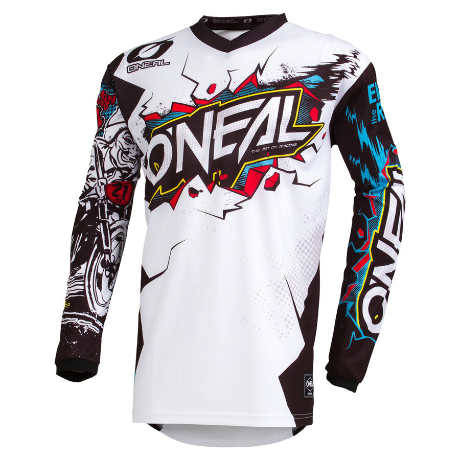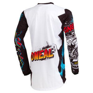 Maglietta cross da bambino. Realizzata in materiale traspirante e in grado di assorbire il sudore. Motivo termostampato. Imbottitura del gomito cucita all'interno. Parte posteriore allungata per mantenere la maglia infilata. Collo a V